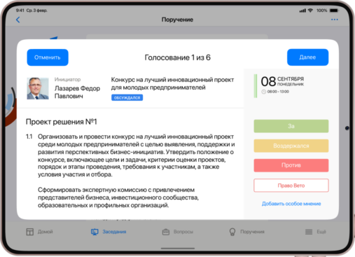 - Проведение голосования по проектам решений, организация опросов и автоматическое формирование протокола заседания.